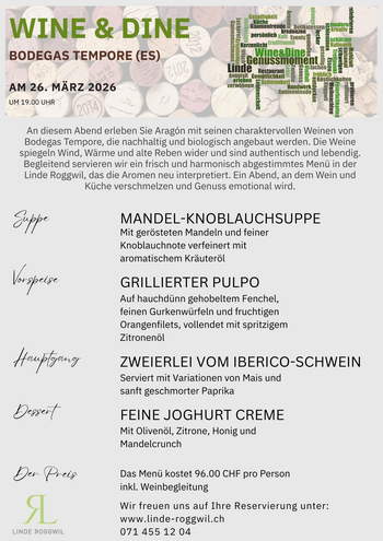 Auch in der Linde Roggwil stehen das Produkt, die Saisonalität und ehrliches Handwerk im Mittelpunkt. Für dieses Wine & Dine haben wir ein Menü komponiert, das die Aromen Aragónes aufnimmt und fein interpretiert: